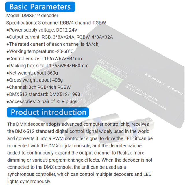 DMX512 Decoder RGBW 4CH DC12V 24V with XLR Plug
